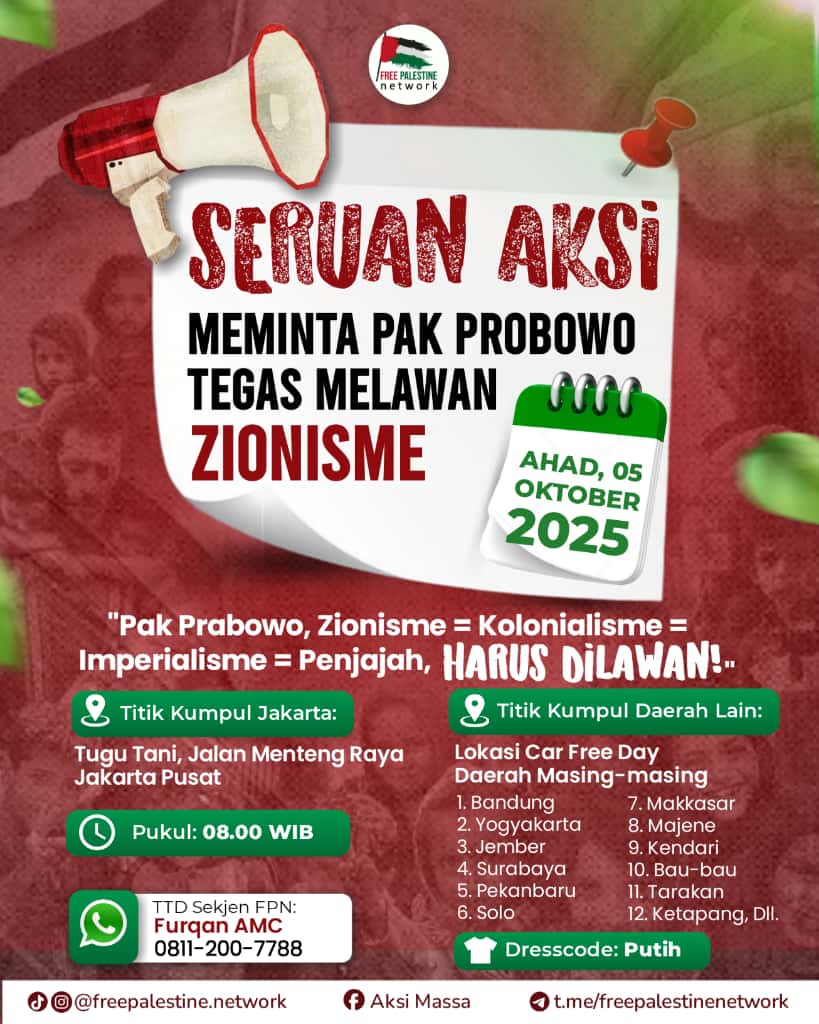 Dalam aksi itu nanti, pihaknya akan mendesak Presiden Prabowo Subianto agar bersifat tegas terhadap Israel. "SERUAN AKSI MEMINTA PAK PRABOWO TEGAS MELAWAN ZIONISME," demikian tertera dalam flyer.