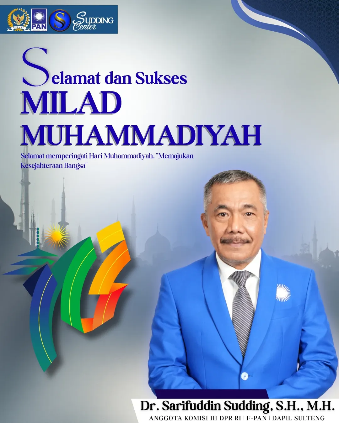 RAJAMEDIA.CO - Jakarta, Muhammadiyah - Anggota Komisi III DPR dari Fraksi PAN Sarifuddin Sudding turut menyampaikan ucapan selamat Milad ke-113 Muhammadiyah yang jatuh pada hari ini, Selasa, (18/11/2025).