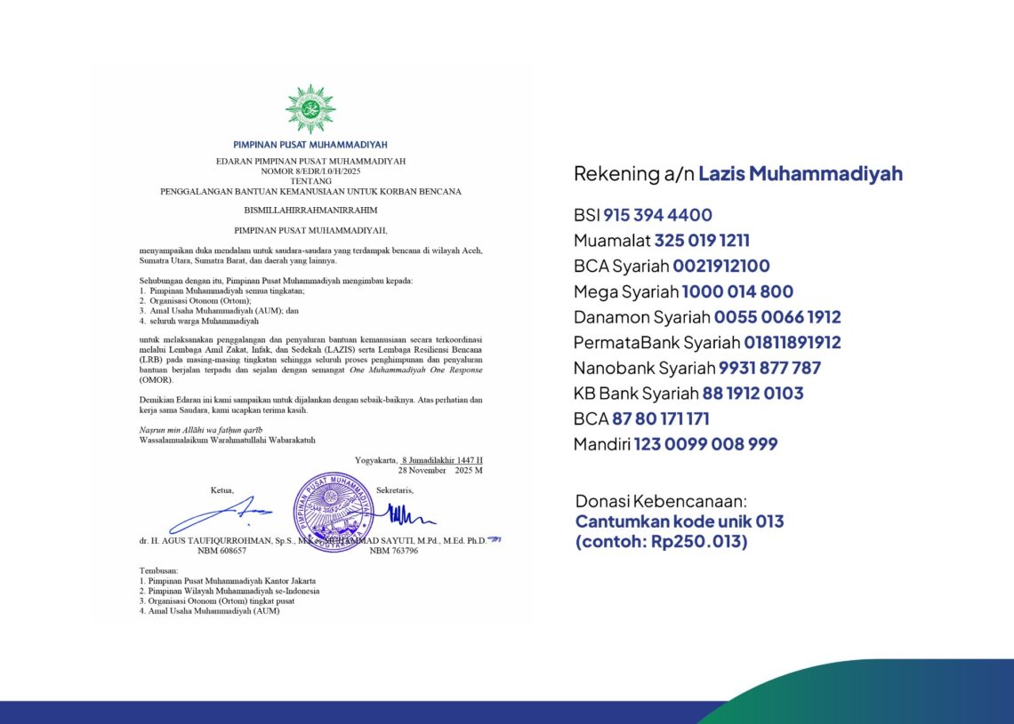 Seruan ini tertuang dalam Edaran Nomor 8/EDR/I.0/H/2025 yang ditandatangani Ketua PP Muhammadiyah Agus Taufiqurrahman di Yogyakarta, Jumat (28/11/2025).