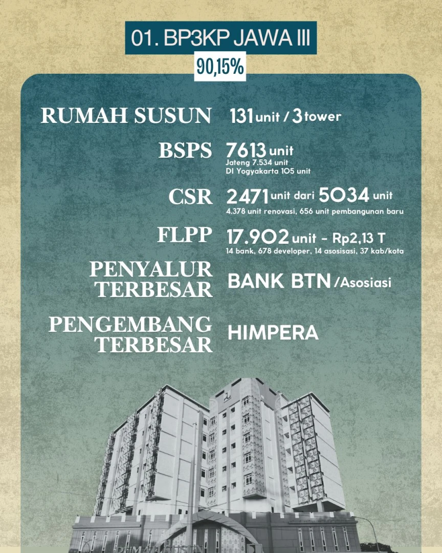 BP3KP Jawa II (Jabar) yang berada di posisi kelima dengan realisasi 80,37 persen justru mencatat kinerja FLPP tertinggi nasional: 48.192 unit rumah setara Rp6,03 triliun.