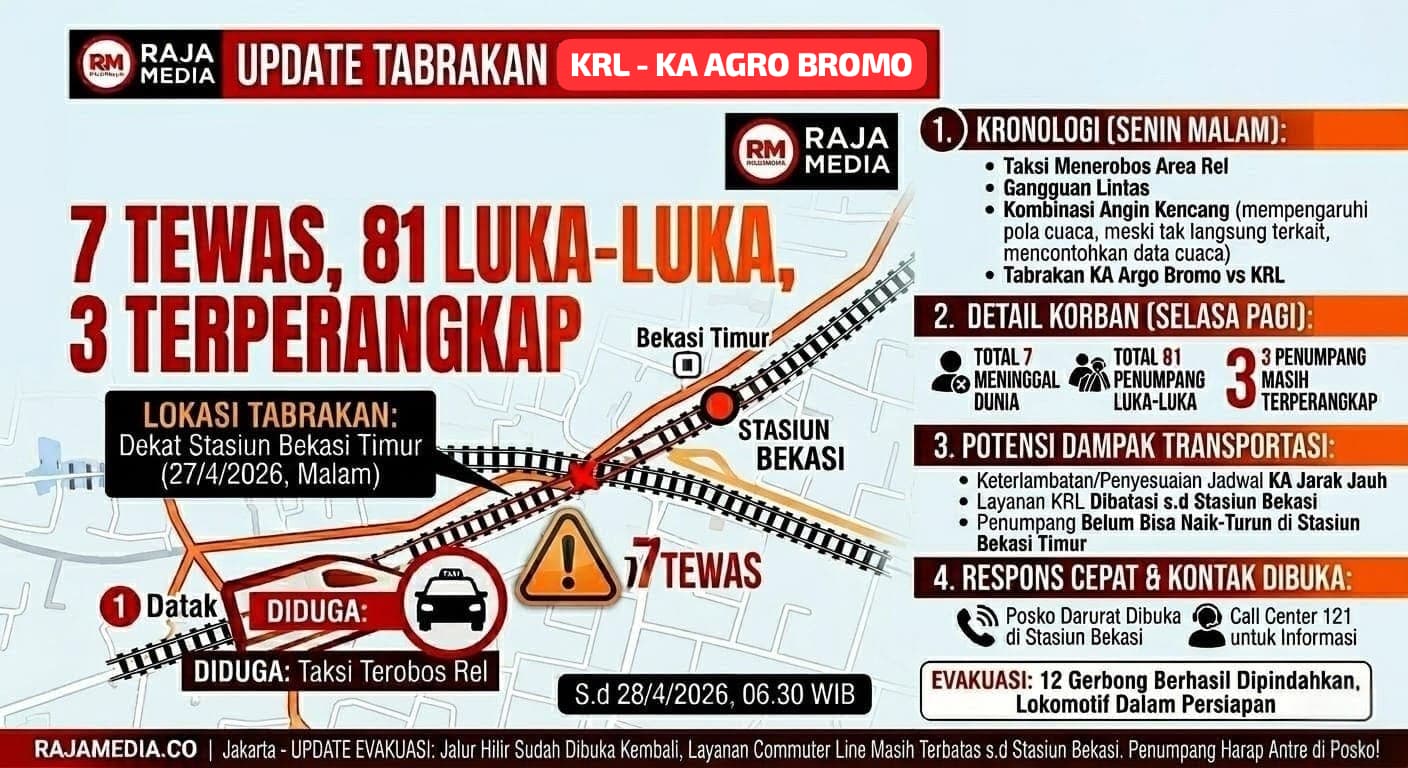RAJAMEDIA.CO - Bekasi - Insiden tragis mengguncang dunia perkeretaapian nasional. KA Argo Bromo Anggrek terlibat tabrakan fatal dengan rangkaian Commuter Line (KRL) di dekat Stasiun Bekasi Timur, Senin malam (27/4/2026).